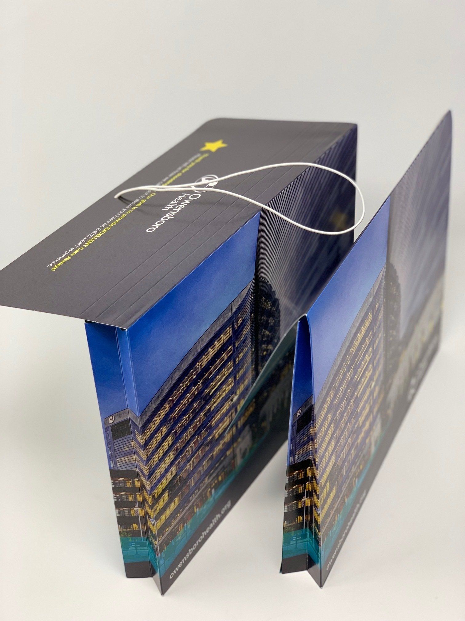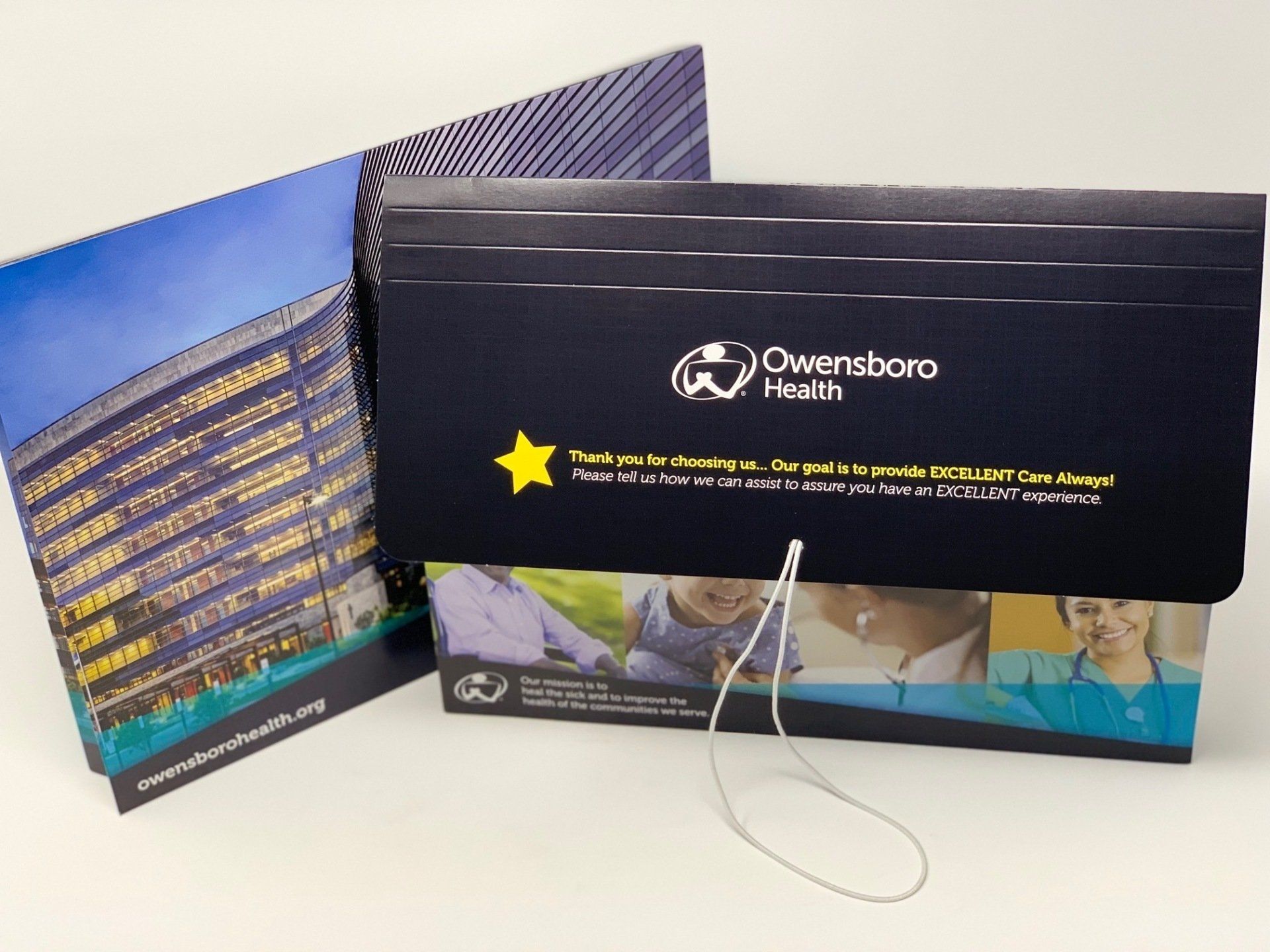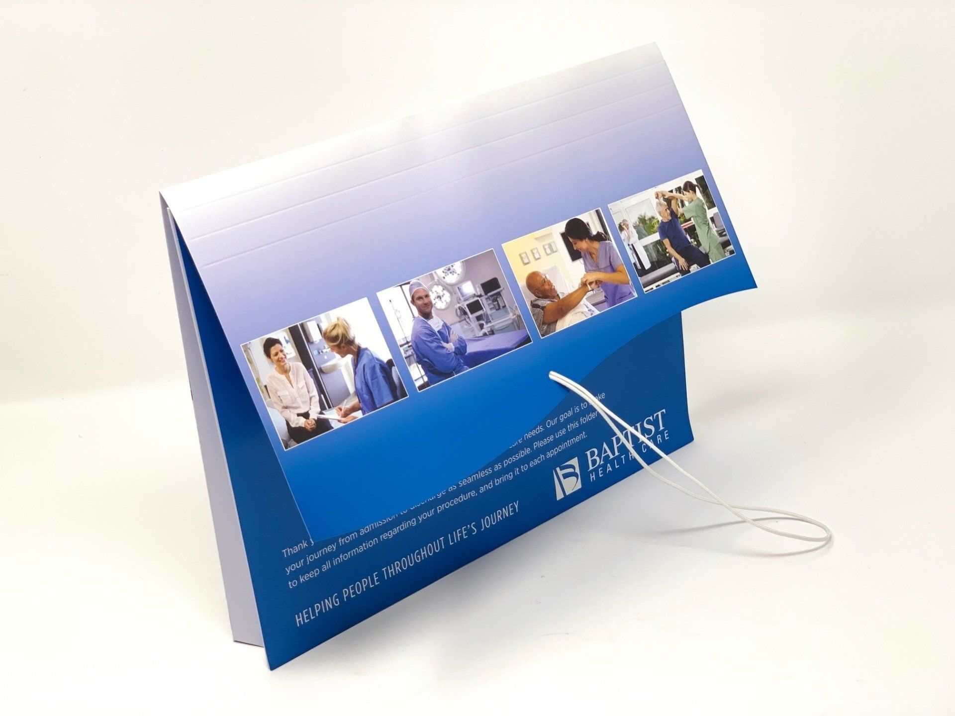 Our patient discharge folders include several handy features such as organizational tabs (up to 1.5” expansion) and elastic closure bands. Our folders can also include custom items like ‘thank you’ note cards, appointment cards, and business cards in convenient slots. An important feature of our folder is it comes with gussets pointed inward and ready to use. We are also able to produce other customized options to fit your needs.